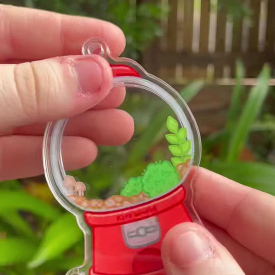 This shaker keychain features a red gumball machine with a little terrarium inside! It is openable which means you can slide the keychain open and put whatever little creatures you like inside! Choose 3 little bug inside pieces for your shaker, or click here to buy additional pieces!